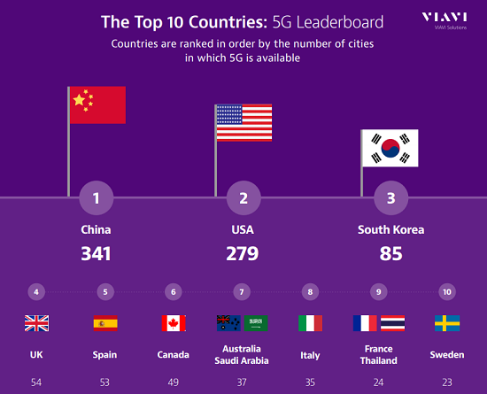 由于5G技術(shù)的采用速度比以往任何移動(dòng)技術(shù)都要快,目前全球商用5G服務(wù)的國(guó)家已達(dá)61個(gè),自2020年1月以來(lái)增長(zhǎng)了80%。擁有5G網(wǎng)絡(luò)城市最多的三個(gè)國(guó)家分別是中國(guó)(341座)、美國(guó)(279座)和韓國(guó)(85座)。英國(guó)現(xiàn)在有54個(gè)城市擁有5G網(wǎng)絡(luò),西班牙緊隨其后,有53個(gè)城市擁有5G網(wǎng)絡(luò)。去年,全球?qū)崿F(xiàn)商用5G部署的國(guó)家新增27個(gè),其中3個(gè)國(guó)家已進(jìn)入覆蓋城市前十--加拿大有49個(gè)城市,法國(guó)和泰國(guó)并列24個(gè)城市。
