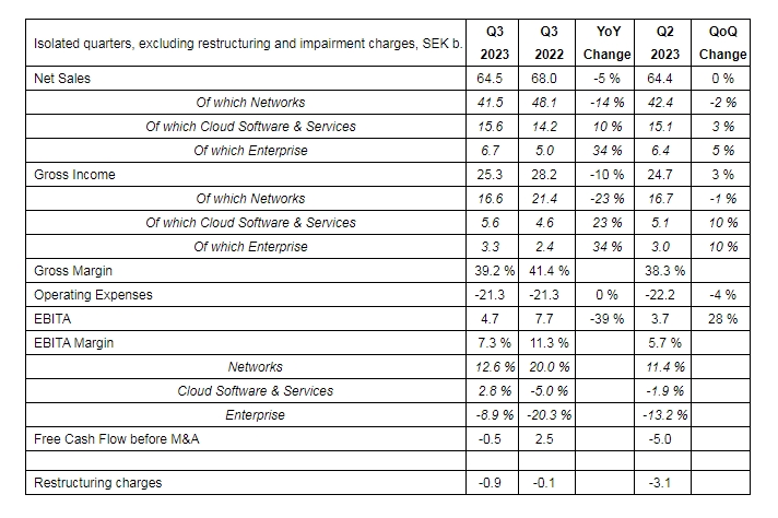 2023年第三季度的業(yè)績(jī)符合預(yù)期,扣除重組費(fèi)用的EBITA利潤(rùn)率為7.3%,對(duì)應(yīng)的EBITA為47億瑞典克朗。集團(tuán)有機(jī)銷售額(按可比單位和貨幣調(diào)整后)下降10%,網(wǎng)絡(luò)業(yè)務(wù)有機(jī)銷售額下降16%,部分被云軟件和服務(wù)業(yè)務(wù)有機(jī)增長(zhǎng)5%和企業(yè)業(yè)務(wù)有機(jī)增長(zhǎng)10%所抵消。