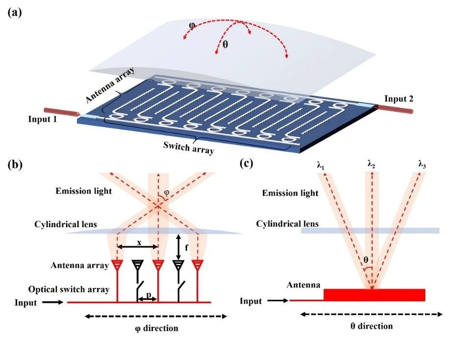 激光雷達(dá)技術(shù)由于具有較高的分辨率和探測(cè)精度,近年來(lái)受到越來(lái)越多的關(guān)注。傳統(tǒng)的激光雷達(dá)系統(tǒng)使用機(jī)械旋轉(zhuǎn)或MEMS等部件來(lái)實(shí)現(xiàn)光束掃描,但這些部件的可靠性仍然存疑。相較而言,硅基集成固態(tài)掃描芯片體積小、成本低,不依賴可移動(dòng)的機(jī)械掃描部件,因此可靠性和壽命得到了大大提高。其中基于光學(xué)相控陣(OPA)的器件一直以來(lái)都是這個(gè)方向的研究熱點(diǎn)。OPA芯片在過(guò)去的幾年里取得了長(zhǎng)足的進(jìn)步,已經(jīng)實(shí)現(xiàn)了185米的遠(yuǎn)距離探測(cè)和高達(dá)180°的大視場(chǎng),但其實(shí)際應(yīng)用仍面臨許多挑戰(zhàn),例如其需要數(shù)千通道的電驅(qū)動(dòng)和復(fù)雜的封裝技術(shù)。近年來(lái),焦平面陣列(FPA)因其控制簡(jiǎn)單、光學(xué)損耗小等優(yōu)點(diǎn)引起了眾多研究者的關(guān)注。在典型的FPA芯片中,輸入光通過(guò)片上開(kāi)關(guān)陣列路由到特定的天線向外發(fā)射,片外透鏡對(duì)發(fā)射光束進(jìn)行準(zhǔn)直和重定向。目前報(bào)道的全固態(tài)FPA芯片大多使用熱調(diào)諧馬赫-曾德?tīng)柛缮鎯x(MZI)開(kāi)關(guān)樹(shù)作為光開(kāi)關(guān)陣列。若FPA芯片采用MZI二分樹(shù)結(jié)構(gòu)時(shí),則需要調(diào)控log2N個(gè)光開(kāi)關(guān)才能將輸入光切換到指定天線出射,故芯片總功耗約為log2N×P,其中N為芯片總通道數(shù),P為單個(gè)開(kāi)關(guān)的功耗。由于級(jí)聯(lián)MZI開(kāi)關(guān)尺寸過(guò)大,目前全固態(tài)FPA芯片集成密度并不高,這限制了其掃描范圍。