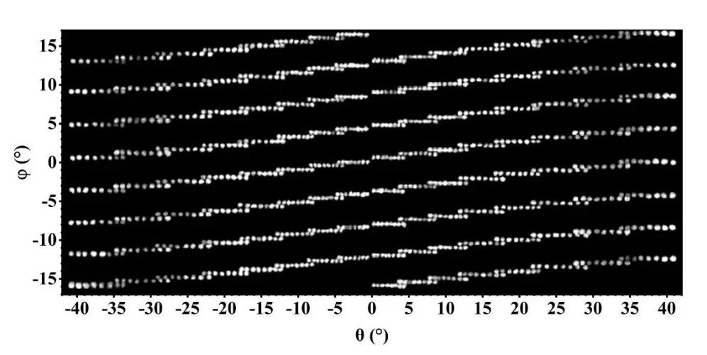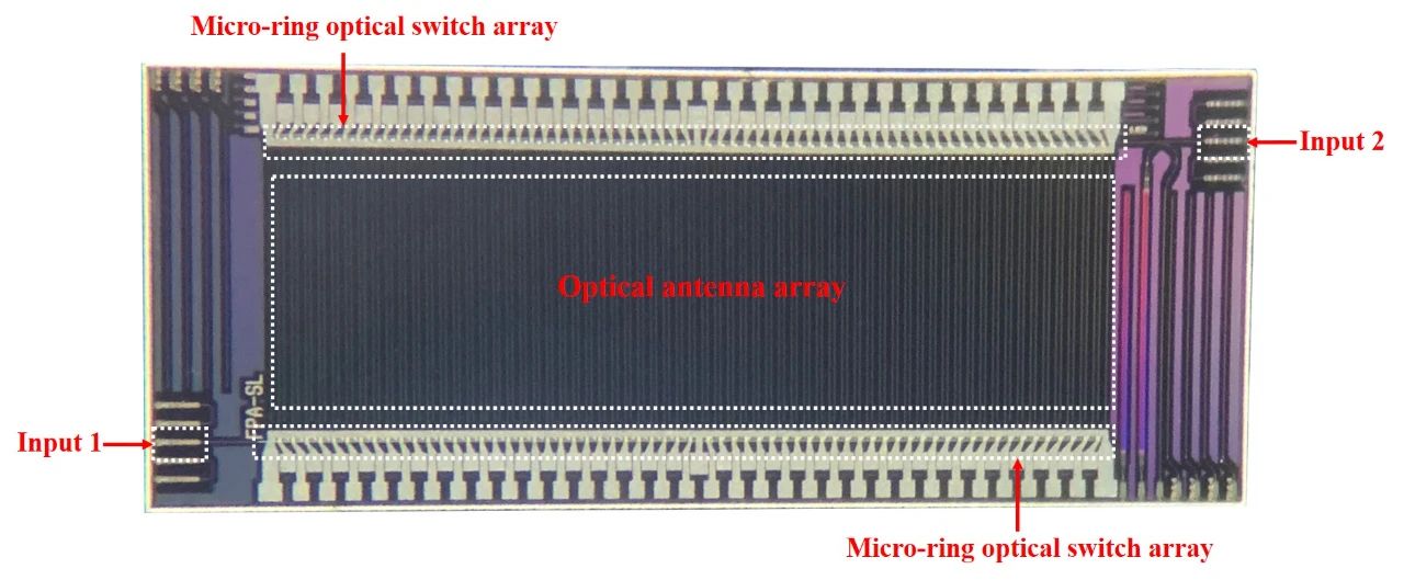 合作團(tuán)隊(duì)研制了一種比MZI二分樹(shù)結(jié)構(gòu)更緊湊的基于微環(huán)開(kāi)關(guān)陣列的FPA芯片。所研制的FPA芯片操作復(fù)雜度極低,在工作時(shí)僅開(kāi)啟一個(gè)光開(kāi)關(guān),將芯片總功耗從log2N×P進(jìn)一步降低到P。通過(guò)將光切換到不同位置的天線并且調(diào)節(jié)輸入波長(zhǎng),實(shí)現(xiàn)了FPA芯片的二維掃描。該芯片采用了視場(chǎng)拼接技術(shù),在1520 nm至1590 nm的波長(zhǎng)范圍內(nèi),設(shè)置8根具有不同掃描范圍的天線,這些天線的視場(chǎng)彼此略有重疊,嚴(yán)格拼接出了大于40°的整體視場(chǎng);并采用旋轉(zhuǎn)對(duì)稱結(jié)構(gòu),雙端輸入激光,將橫向視場(chǎng)擴(kuò)展至80°以上??傮w上該FPA實(shí)現(xiàn)了相當(dāng)于8線激光雷達(dá)的二維掃描,視場(chǎng)角為82°× 32°,光束發(fā)散為0.07°×0.07°,光束的背景抑制比大于20 dB。該芯片具有可擴(kuò)展性,當(dāng)使用更多的天線進(jìn)行視場(chǎng)拼接和級(jí)聯(lián)更多的光開(kāi)關(guān)時(shí),預(yù)計(jì)可以實(shí)現(xiàn)更大范圍的二維掃描。