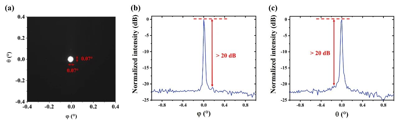 圖 3. (a) 遠(yuǎn)場(chǎng)光斑及發(fā)散角 (b)(c) 遠(yuǎn)場(chǎng)背景抑制比