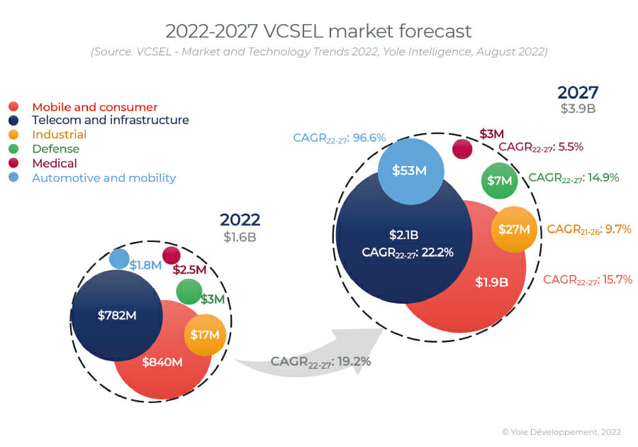 VCSEL市場受消費和數(shù)據(jù)通信應用驅動,預計2027年將達39億美元