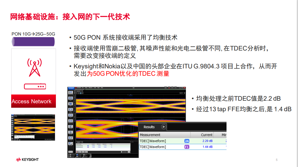 根據(jù)工信部的最新數(shù)據(jù),截至2022年10月底,全國共有110個(gè)城市達(dá)到千兆城市建設(shè)標(biāo)準(zhǔn),千兆城市平均城市家庭千兆光纖網(wǎng)絡(luò)覆蓋率超過100%,實(shí)現(xiàn)城市家庭千兆光網(wǎng)全覆蓋。隨著各省市對“千兆光網(wǎng)”政策的大力推進(jìn),10G PON技術(shù)正逐漸完成接入網(wǎng)升級。而下一代接入網(wǎng)技術(shù)開發(fā)正在路上,今年9月,IEEE和ITU-T已經(jīng)完成了25G和50G PON的標(biāo)準(zhǔn)制定。是德科技預(yù)計(jì)2023年底將會有25G、50G商業(yè)化產(chǎn)品發(fā)布,2024/2025開始商業(yè)化部署,中國則領(lǐng)先其他地區(qū)2-3年時(shí)間,直接從10G PON跨越到50G PON的部署。針對25G、50G PON的預(yù)研,是德科技推出了相應(yīng)的測試技術(shù),測試軟件和硬件,加快市場應(yīng)用。公司和中國以及其他國家的頭部企業(yè)在ITU G.9804.3 項(xiàng)目上緊密合作,開發(fā)出為50G PON優(yōu)化的TDEC 測量。