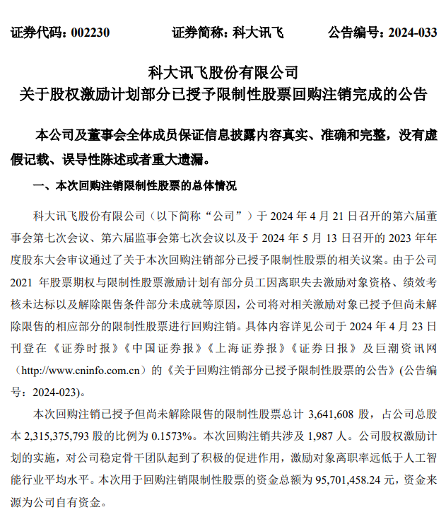 ICC訊 6月11日,科大訊飛發(fā)布關(guān)于股權(quán)激勵(lì)計(jì)劃部分已授予限制性股票回購(gòu)注銷(xiāo)完成的公告稱(chēng),科大訊飛已完成本次回購(gòu)注銷(xiāo)部分已授予限制性股票。