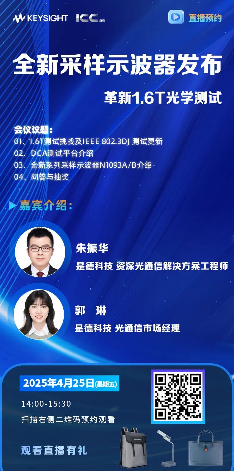 4月25日(下周)ICC訊石與是德科技聯(lián)合開展《全新采樣示波器發(fā)布:革新1.6T光學(xué)測試》線上研討會,會議將介紹1.6T 光模塊標(biāo)準(zhǔn)進(jìn)展、測試挑戰(zhàn)及全新系列采樣示波器N1093A/B的強(qiáng)大功能。直播設(shè)置問答互動與抽獎環(huán)節(jié),歡迎大家預(yù)約直播一起來聊聊1.6T光模塊。