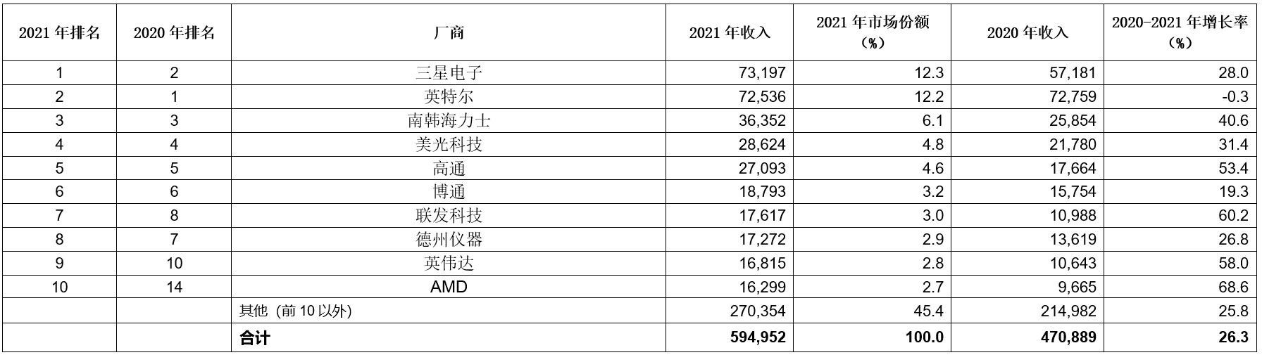 三星電子自2018年以來首次超越英特爾重回第一,盡管領(lǐng)先優(yōu)勢還不到1%,該公司在2021年的收入增長了28%(見表一)。英特爾的收入下降了0.3%,市場份額為12.2%,相較于三星的12.3%。在排名前十的半導體廠商中,2021年內(nèi)增長最快的是AMD和聯(lián)發(fā)科技,兩家公司在2021年分別增長了68.6%和60.2%。