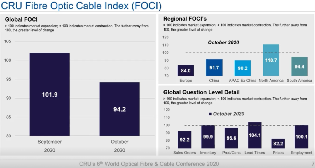 展望Q4,從目前10月份的 CRU FOCI指數(shù)來看(Fibre Optic Cable Index,一項(xiàng)重點(diǎn)關(guān)注光纖光纜市場(chǎng)的月度調(diào)查核心指數(shù)),當(dāng)月光纜需求出現(xiàn)小幅收縮。按區(qū)域來看,歐洲、亞太地區(qū)(中國(guó)除外)、中國(guó)、南美市場(chǎng)的需求均出現(xiàn)不同程度的收縮,而北美市場(chǎng)則實(shí)現(xiàn)增長(zhǎng)。其他方面,價(jià)格成為收縮幅度較大的一項(xiàng)指數(shù)。