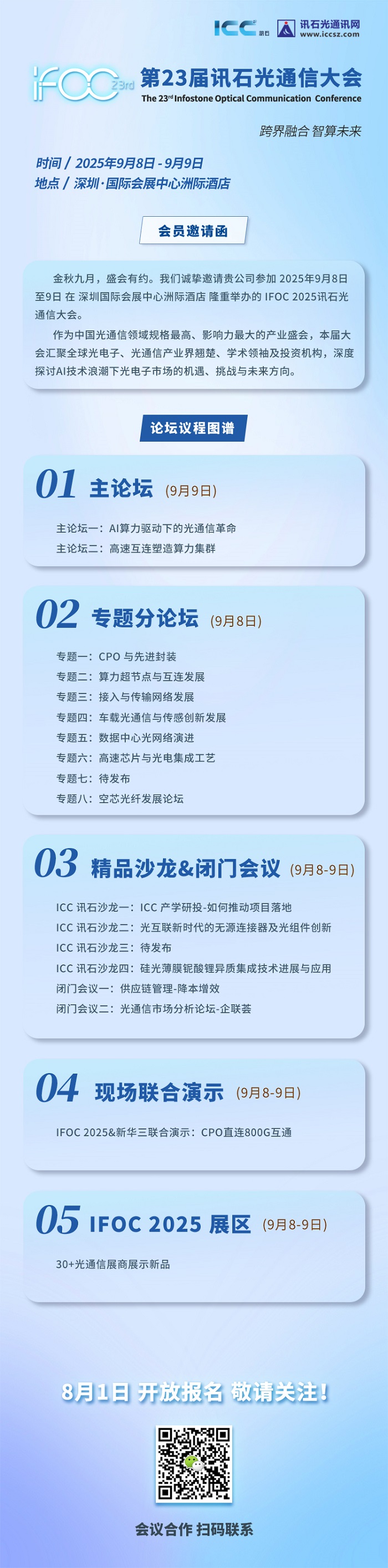 ICC訊 2025年9月8-9日,一年一度的行業(yè)盛會(huì)---IFOC 2025訊石光通信大會(huì)即將于深圳國(guó)際會(huì)展中心洲際酒店隆重開幕。本屆大會(huì)聚焦光通信領(lǐng)域前沿技術(shù)、市場(chǎng)動(dòng)態(tài)與產(chǎn)業(yè)交流,攜手產(chǎn)學(xué)研投多方力量,共探AI時(shí)代下光電子技術(shù)所面臨的機(jī)遇與挑戰(zhàn),致力成為中國(guó)光通信與光電子市場(chǎng)發(fā)展的“風(fēng)向標(biāo)”。
