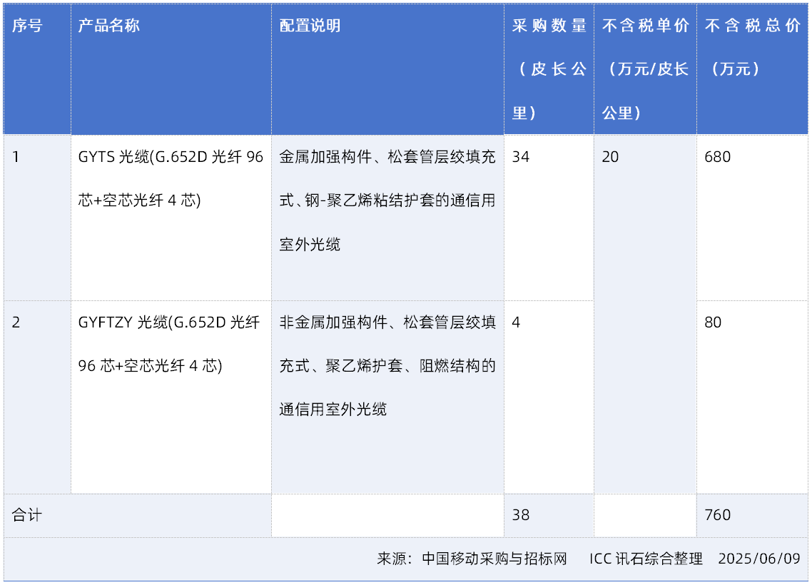 ICC訊 2025年6月7日,中國(guó)移動(dòng)于采購網(wǎng)發(fā)布了《中國(guó)移動(dòng)廣東公司2025年混合光纜(G.652D及空芯光纖)采購項(xiàng)目中標(biāo)候選人公示》。本次集采規(guī)模為38皮長(zhǎng)公里,不含稅單價(jià)限價(jià)20萬元/皮長(zhǎng)公里,總價(jià)限價(jià)760萬元。長(zhǎng)飛光纖光纜股份有限公司成功入選,成為本項(xiàng)目唯一候選廠商。