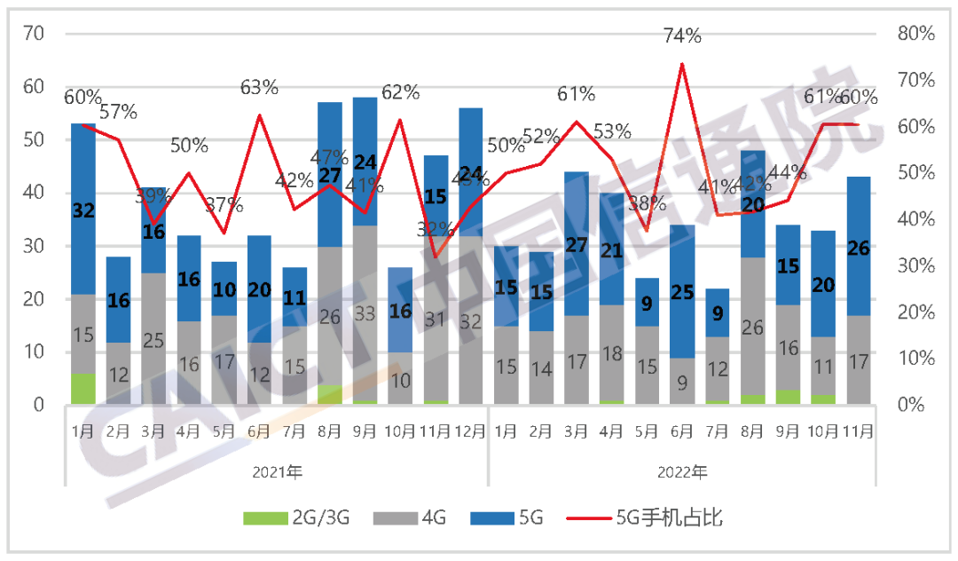 ICC訊 1月5日消息 根據(jù)中國信通院發(fā)布的《2022年11月國內(nèi)手機市場運行分析報告》,2022年1-11月,國內(nèi)市場手機總體出貨量累計2.44億部,同比下降23.2%,其中,5G手機出貨量1.91億部,同比下降20.2%,占同期手機出貨量的78.3%。