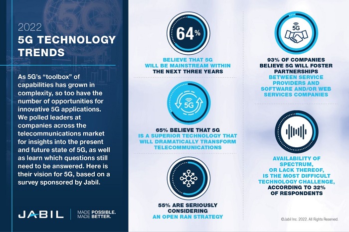 ICC訊(編譯:Nina)上月末(2022年6月28日),Jabil公司(紐交所:JBL)公布其2022年全球5G調(diào)查結(jié)果。盡管存在持續(xù)的技術(shù)和業(yè)務(wù)相關(guān)挑戰(zhàn),但運營商仍加強了5G采用和部署步伐。
