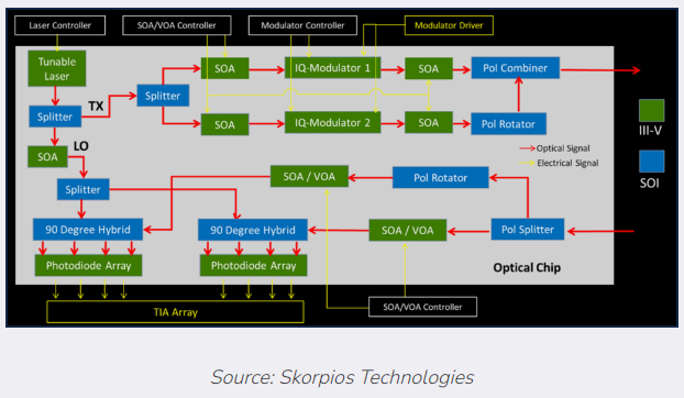 Skorpios(https://www.skorpiosinc.com/)是一家美國(guó)初創(chuàng)公司,開發(fā)了一種將其他材料制成的光學(xué)組件直接集成到硅電路——特別是可以調(diào)制光信號(hào)的硅光子電路——中的方法。該公司通過在硅中精確位置刻蝕凹坑來實(shí)現(xiàn)這一點(diǎn),使得InP激光器芯片和其他光學(xué)組件可以在無需人工干預(yù)的情況下放入。Skorpios將其工藝瞄準(zhǔn)數(shù)據(jù)中心和相干光學(xué)市場(chǎng),并已列出多種量產(chǎn)的數(shù)據(jù)中心模塊和相干PIC。