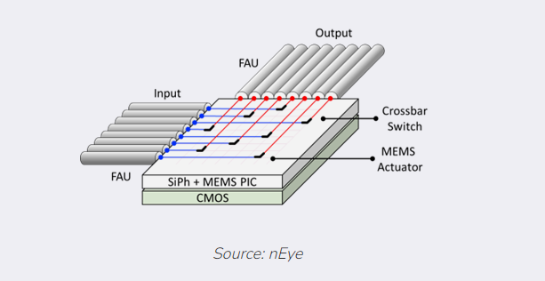 nEye(https://www.neye.ai/)是一家源自加州大學(xué)伯克利分校Ming Wu教授實(shí)驗(yàn)室的早期初創(chuàng)公司,成立于2020年。nEye正在開發(fā)使用基于硅光子學(xué)中微機(jī)電系統(tǒng)(MEMS)交叉開關(guān)的PIC進(jìn)行光子交換。公司認(rèn)為其優(yōu)勢(shì)在于PIC的尺寸非常小、成本低、可靠性高、延遲低和交換速度快。