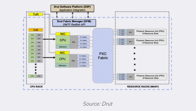 Drut(https://drut.io/)正在開發(fā)一個(gè)支持AI節(jié)點(diǎn)資源虛擬化解耦(virtual disaggregation)的平臺(tái),包括完整的軟件棧、PCIe接口卡以及基于MEMS的光電路交換機(jī)。該組合允許內(nèi)存和存儲(chǔ)等資源池化,并按需動(dòng)態(tài)共享。