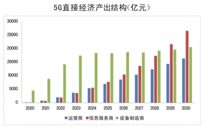 從產(chǎn)出結(jié)構(gòu)看,拉動(dòng)產(chǎn)出增長(zhǎng)的動(dòng)力隨5G商用進(jìn)程的深化而相繼轉(zhuǎn)換。在5G商用初期,運(yùn)營(yíng)商大規(guī)模開展網(wǎng)絡(luò)建設(shè),5G網(wǎng)絡(luò)設(shè)備投資帶來的設(shè)備制造商收入將成為5G直接經(jīng)濟(jì)產(chǎn)出的主要來源,預(yù)計(jì)2020年,網(wǎng)絡(luò)設(shè)備和終端設(shè)備收入合計(jì)約4500億元,占直接經(jīng)濟(jì)總產(chǎn)出的94%。在5G商用中期,來自用戶和其他行業(yè)的終端設(shè)備支出和電信服務(wù)支出持續(xù)增長(zhǎng),預(yù)計(jì)到2025年,上述兩項(xiàng)支出分別為1.4萬(wàn)億和0.7萬(wàn)億元,占到直接經(jīng)濟(jì)總產(chǎn)出的64%。在5G商用中后期,互聯(lián)網(wǎng)企業(yè)與5G相關(guān)的信息服務(wù)收入增長(zhǎng)顯著,成為直接產(chǎn)出的主要來源,預(yù)計(jì)2030年,互聯(lián)網(wǎng)信息服務(wù)收入達(dá)到2.6萬(wàn)億元,占直接經(jīng)濟(jì)總產(chǎn)出的42%。