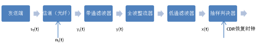 非相干解調(diào)是采用包絡(luò)檢測法來恢復信號。光探測器上就是一個低通濾波器以檢測光信號的包絡(luò)信息并將其轉(zhuǎn)換為電信號。整個系統(tǒng)框圖如下,誤碼率受信噪比影響。經(jīng)過一通復雜的計算可得到在大信噪比情況下,