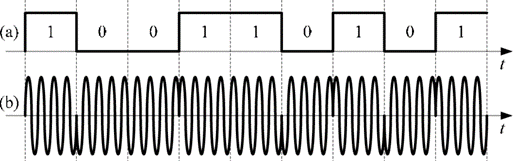 我們首先從非相干光通信說起,其包含非相干調(diào)制和非相干解調(diào)兩部分。非相干調(diào)制會對光信號的幅度進行模擬調(diào)制(AM),需要激光器(或光調(diào)制器)盡量工作在線性區(qū)間。在傳輸NRZ數(shù)字信號時,我們用OOK(2ASK)做為一個簡化版的調(diào)制模型以利于計算。下圖中上面的綠色方波為調(diào)制信號(光通信中對應基頻為幾十GHz量級),中間的粉色正弦波為載波信號(光通信中為幾百THz),下面的紅色波形即為OOK調(diào)制后的信號。