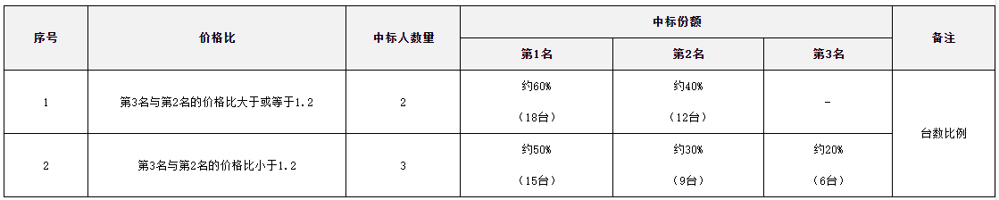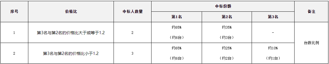 本項目共劃分為2個標包,CR-A1和CR-A2。CR-A1預(yù)估采購數(shù)量30臺,CR-A2預(yù)估采購數(shù)量9臺。中標份額如下表所示。
