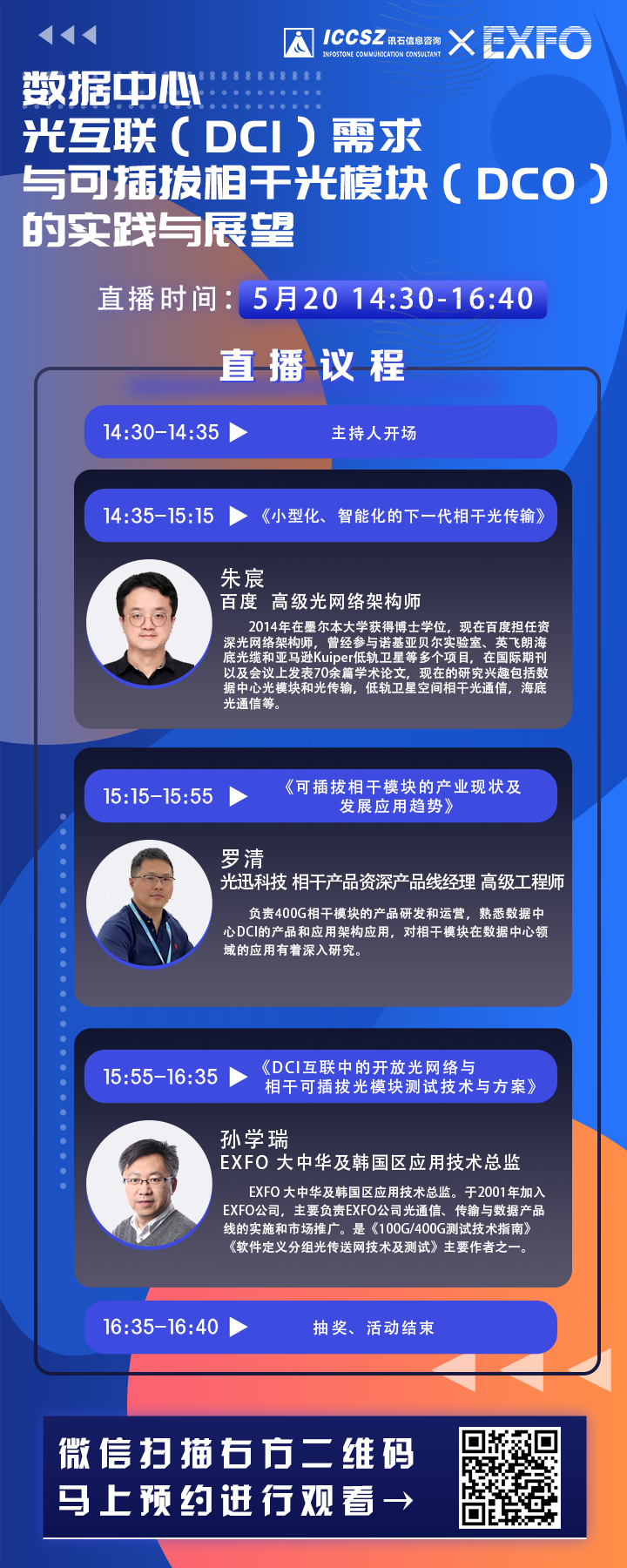 2022年5月20日,訊石攜手EXFO舉辦主題為“數(shù)據(jù)中心光互聯(lián)(DCI)需求與可插拔相干光模塊(DCO)的實(shí)踐與展望”的線上直播,主要圍繞相干光技術(shù)在數(shù)據(jù)中心光互聯(lián)的應(yīng)用為主題,分別邀請(qǐng)了百度、光迅和EXFO的技術(shù)專家進(jìn)行多角度探討。內(nèi)容涵蓋數(shù)據(jù)中心光網(wǎng)絡(luò)架構(gòu)、實(shí)際需求與期待、未來(lái)趨勢(shì);相干光模塊開(kāi)發(fā)和生產(chǎn)廠家的實(shí)踐與研發(fā)方向,以及光模塊及光網(wǎng)絡(luò)的測(cè)試技術(shù)及挑戰(zhàn)等內(nèi)容。期望分別從行業(yè)不同的角度,既能夠闡述當(dāng)前行業(yè)現(xiàn)狀、貼近工業(yè)實(shí)際,同時(shí)也對(duì)行業(yè)發(fā)展進(jìn)行預(yù)測(cè),表達(dá)自己觀點(diǎn)。