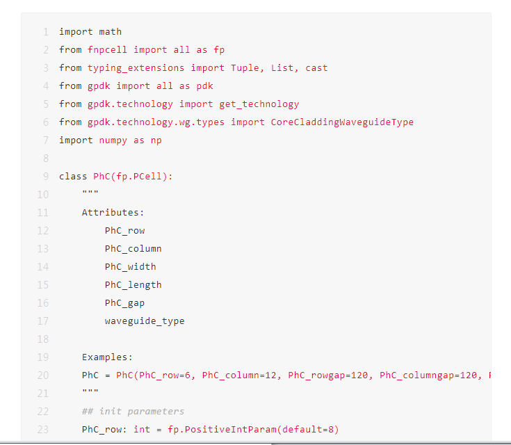 光子晶體為周期結(jié)構(gòu),基本單元也從傳統(tǒng)的單一規(guī)則結(jié)構(gòu)演變成多個基本結(jié)構(gòu)組合的結(jié)構(gòu)到?jīng)]有規(guī)律的拓?fù)浣Y(jié)構(gòu)。教程提供的代碼從底層出發(fā),支持用戶自定義周期結(jié)構(gòu),在用戶定義的周期結(jié)構(gòu)的基礎(chǔ)上通過幾個簡單參數(shù)即可實(shí)現(xiàn)任意光子晶體鏈路的搭建。