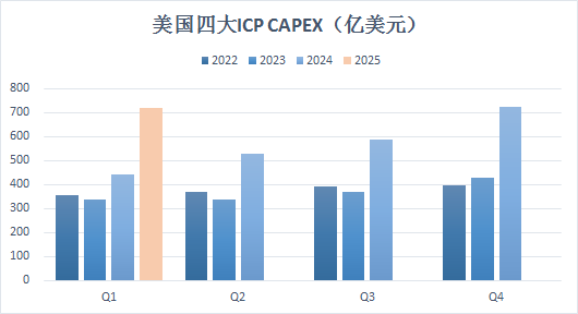 ICC訊 2025年第一季度,美國四大互聯(lián)網(wǎng)內(nèi)容提供商(ICP)——谷歌、微軟、Meta和亞馬遜——在資本支出方面表現(xiàn)活躍,合計投入近720億美元,同比增長62%,主要聚焦于AI基礎(chǔ)設(shè)施和云計算擴(kuò)張。四家公司的財報顯示,全球AI競賽和地緣政治風(fēng)險正推動其加速投資,盡管面臨關(guān)稅、供應(yīng)鏈波動等外部壓力。