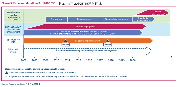 當前的圖表顯示,5G系統(tǒng)將持續(xù)演進至本十年末,同時5G-Advanced和6G也在并行定義。這突出了6G的演進性質(zhì)。為了使6G能在2030年開始部署,其標準需在2029年就準備就緒。