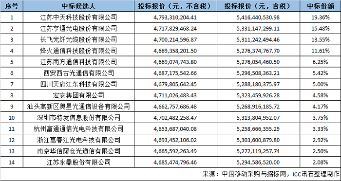 ICC訊 2025年6月7日,中國移動公布2025年至2026年普通光纜產(chǎn)品集采中標(biāo)候選人名單,中天、亨通、長飛、烽火、特發(fā)及永鼎等14家廠商上榜。
